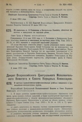 Декрет Всероссийского Центрального Исполнительного Комитета и Совета Народных Комиссаров. О частных художественно-профессиональных учебных заведениях и промышленно-экономических курсах. 11 июля 1923 года