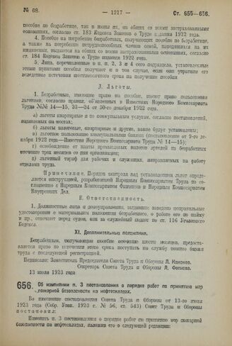 Постановление Совета Труда и Обороны. Об изменении п. 3 постановления о порядке работ по принятию мер пожарной безопасности на нефтескладах. 13 июля 1923 года