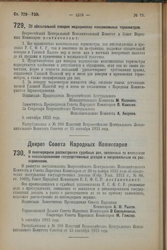 Декрет Совета Народных Комиссаров. О внеочередном рассмотрении судебных дел, связанных со взиманием и инкассированием государственных доходов и неправильным их расходованием. 5 сентября 1923 года // Распубликован в № 208 Известий Всероссийского Центрального Исполнительного Комитета Советов от 15 сентября 1923 года.