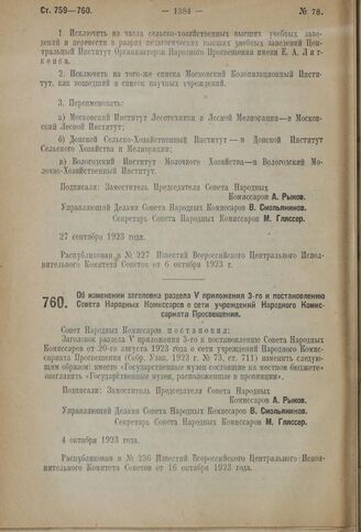 Декрет Совета Народных Комиссаров. Об изменении заголовка раздела V приложения 3-го к постановлению Совета Народных Комиссаров о сети учреждений Народного Комиссариата Просвещения. 4 октября 1923 г.