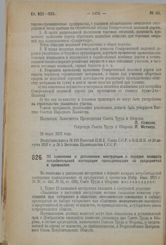 Постановление Совета Труда и Обороны. Об изменении и дополнении инструкции о порядке возврата потребительской кооперации принадлежащих ей предприятий и промыслов. 20 июля 1923 г.