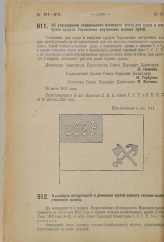 Декрет Совета Народных Комиссаров. Об утверждении специального кормового флага для судов и плавучих средств Управления внутренних водных путей. 30 июля 1923 г.