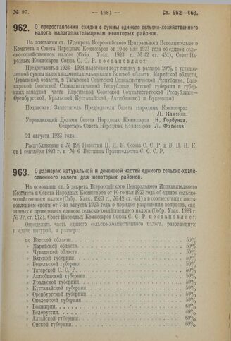 Декрет Совета Народных Комиссаров. О предоставлении скидки с суммы единого сельско-хозяйственного налога налогоплательщикам некоторых районов. 21 августа 1923 г.
