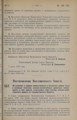 Постановление Экономического Совета. Об условиях и порядке предоставления и погашения займов (ссуд) в основные капиталы сельско-хозяйственных кредитных товариществ за счет средств, отпускаемых через систему сельско-хозяйственного кредита из государственного бюджета. 9 июня 1928 г.
