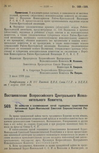Постановление Всероссийского Центрального Исполнительного Комитета. Об амнистии в ознаменование пятой годовщины существования Автономной Бурят-Монгольской Советской Социалистической Республики. 6 июля 1928 г.