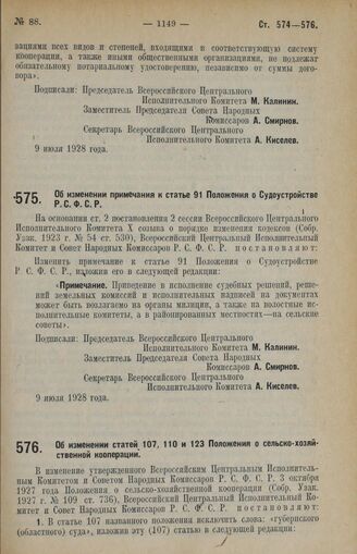Постановление Всероссийского Центрального Исполнительного Комитета и Совета Народных Комиссаров. Об изменении статей 107, 110 и 123 Положения о сельско-хозяйственной кооперации. 9 июля 1928 г.