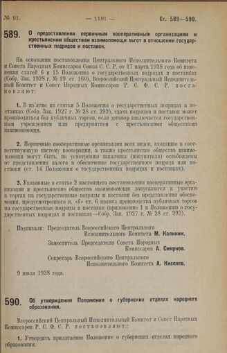 Постановление Всероссийского Центрального Исполнительного Комитета и Совета Народных Комиссаров. О предоставлении первичным кооперативным организациям и крестьянским обществам взаимопомощи льгот в отношении государственных подрядов и поставок. 9 и...
