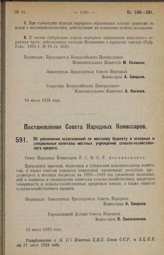 Постановление Совета Народных Комиссаров. Об увеличении ассигнований по местному бюджету в основные и специальные капиталы местных учреждений сельско-хозяйственного кредита. 12 июля 1928 г.