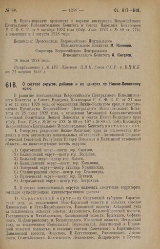 Постановление Всероссийского Центрального Исполнительного Комитета. О составе округов, районов и их центрах по Нижне-Волжскому краю. 23 июля 1928 г.