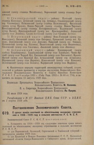 Постановление Экономического Совета. О сроках взноса платежей по обязательному окладному страхованию в 1928-1929 году в сельских местностях Р.С.Ф.С.Р. 16 июля 1928 г. // Распубликовано в № 185 Известий Ц.И.К. Союза С.С.Р. и В.Ц.И.К. от 11 августа 1928 г.