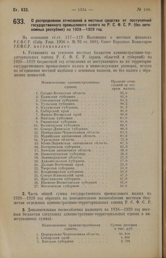 Постановление Совета Народных Комиссаров. О распределении отчислений в местные средства от поступлений государственного промыслового налога по Р.С.Ф.С.Р. (без автономных республик) на 1928-1929 год. 1 августа 1928 г. // Распубликовано в № 180 Известий Ц.И.К. Союза С.С.Р. и В.Ц.И.К. от 4 августа 1928 г.