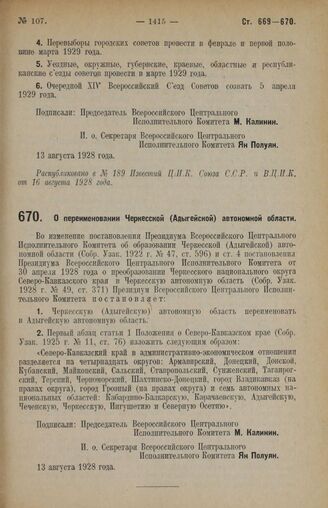 Постановление Всероссийского Центрального Исполнительного Комитета. О переименовании Черкесской (Адыгейской) автономной области. 13 августа 1928 г.