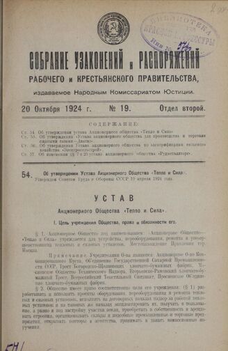 Об утверждении Устава Акционерного Общества «Тепло и Сила». Утвержден Советом Труда и Обороны СССР 19 апреля 1924 года
