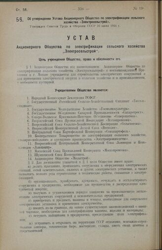Об утверждении Устава Акционерного Общества по электрификации сельского хозяйства «Электросельстрой». Утвержден Советом Труда и Обороны СССР 10 июня 1924 г.