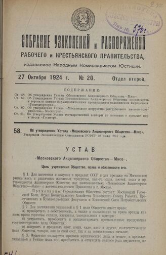 Об утверждении Устава «Московского Акционерного Общества—Мясо». Утвержден Экономическим Совещанием РСФСР 28 июля 1924 года