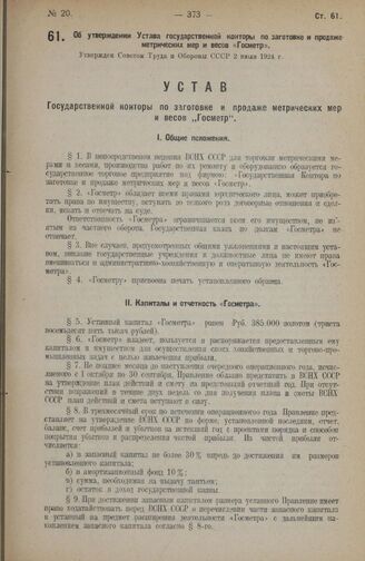 Об утверждении Устава государственной конторы по заготовке и продаже метрических мер и весов «Госметр». Утвержден Советом Труда и Обороны СССР 2 июля 1924 г.