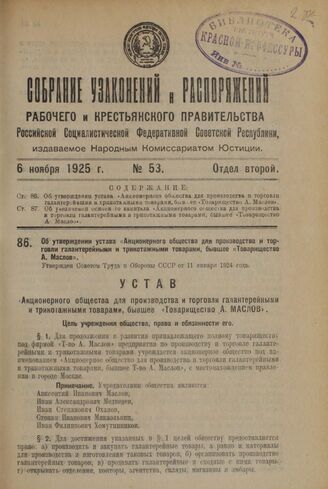 Главная Собрание законов и распоряжений правительства РСФСР и СССР Собрание законов и распоряжений Рабоче-Крестьянского Правительства ... Собрание узаконений и распоряжений Рабочего и Крестьянского правите... Собрание узаконений и распоряжений Рабочего и Крестьянского правите... Документы Об утверждении устава «Акционерного общества для производства и тор...