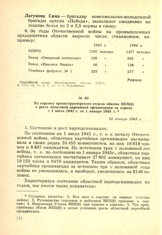 Из справки оргинструкторского отдела обкома ВКП(б) о росте областной партийной организации за период с 1 июля 1941 г. по 1 января 1945 г. 24 января 1945 г. // Партийный архив Вологодского обкома КПСС, ф. 2522, оп. 16, д. 48, л. 46. Подлинник.
