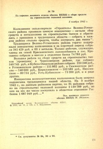 Из справки военного отдела обкома ВКП(б) о сборе средств на строительство танковой колонны. 3 ноября 1942 г. // Партийный архив Вологодского обкома КПСС, ф. 2522, оп. 10, д. 169, л. 6. Подлинник.