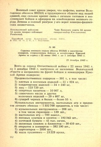 Справка военного отдела обкома ВКП(б) о количестве подарков, отправленных бойцам и командирам Красной Армии за период с 22 июня 1941 г. по 1 декабря 1943 г. 21 декабря 1943 г. // Партийный архив Вологодского обкома КПСС, ф. 2522, оп. 15, д. 6, л. 127. Подлинник.