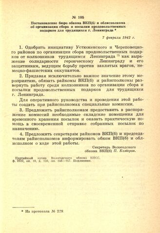 Постановление бюро обкома ВКП(б) и облисполкома об организации сбора и посылки продовольственных подарков для трудящихся г. Ленинграда. 7 февраля 1942 г. // Партийный архив Вологодского обкома КПСС, ф. 2522, оп. 10, д. 120, лл. 146—147. Подлинник.