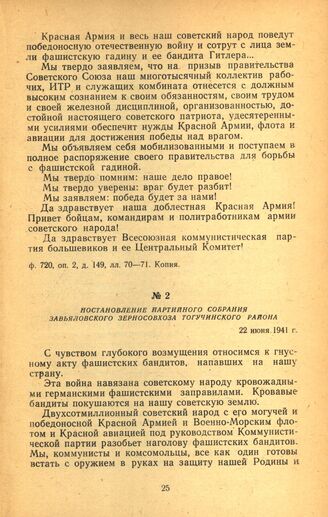 Постановление партийного собрания Завьяловского зерносовхоза Тогучинского района по поводу вероломного нападения фашистской Германии на Советский Союз. 22 июня 1941 г.