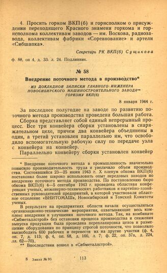 Внедрение поточного метода в производство. Из докладной записки главного инженера Новосибирского машиностроительного завода горкому ВКП(б). 8 января 1944 г.