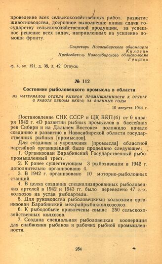 Состояние рыболовецкого промысла в области. Из материалов отдела рыбной промышленности к отчету о работе обкома ВКП(б) за военные годы. 10 августа 1944 г.