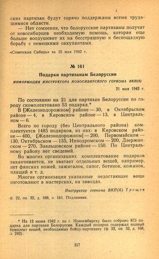 Подарки партизанам Белоруссии. Информация инструктора Новосибирского горкома ВКП(б). 21 мая 1942 г. // ф. 22, оп. 32, д. 168, л. 161. Подлинник.