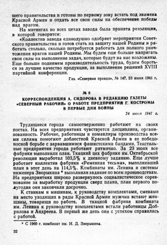 Корреспонденция А. Сидорова в редакцию газеты «Северный рабочий» о работе предприятий г. Костромы в первые дни войны. 24 июня 1941 г.