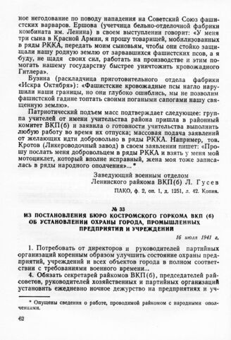 Из постановления бюро Костромского горкома ВКП(б) об установлении охраны города, промышленных предприятии и учреждении. 16 июля 1941 г.