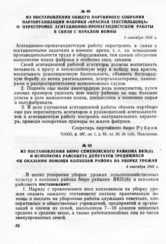 Из постановления бюро Семеновского райкома ВКП(б) и исполкома райсовета депутатов трудящихся об оказании помощи колхозам района на уборке урожая. 4 сентября 1941 г.