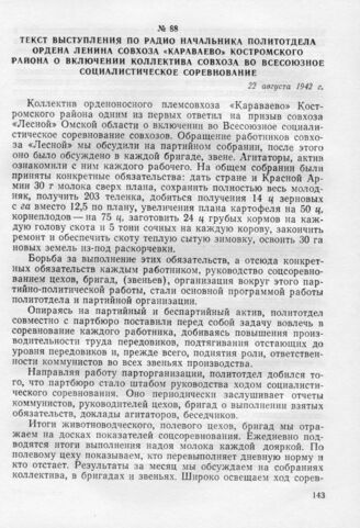 Текст выступления по радио начальника политотдела ордена Ленина совхоза «Караваево» Костромского района о включении коллектива совхоза во всесоюзное социалистическое соревнование. 22 августа 1942 г.
