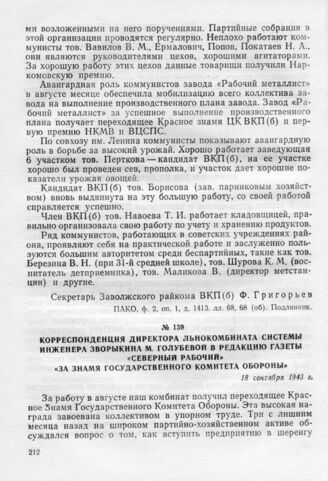 Корреспонденция директора льнокомбината системы инженера Зворыкина М. Голубевой в редакцию газеты «Северный рабочий» «За знамя Государственного Комитета Обороны». 18 сентября 1943 г.