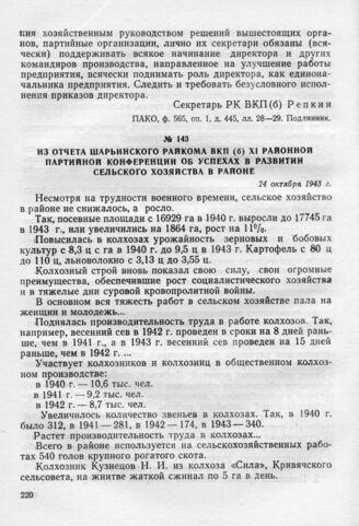 Из отчета Шарьинского райкома ВКП(б) XI районной партийной конференции об успехах в развитии сельского хозяйства в районе. 24 октября 1943 г. // ПАКО, ф. 147, оп. 1, д. 814, лл. 2, 3, 4. Подлинник.