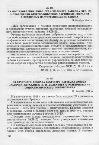 Из постановления бюро Судиславского райкома ВКП(б) о проведении отчетно-выборных партийных собраний в первичных парторганизациях района. 29 декабря 1944 г. // ПАКО, ф. 28, оп. 1, д. 260а, л. 57. Подлинник.