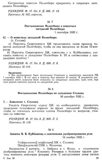 Постановление Политбюро по заявлению Сталина. 16 октября 1932 г. Протокол № 119 // РЦХИДНИ. Ф. 17. Оп. 3. Д. 903. Л. 2.