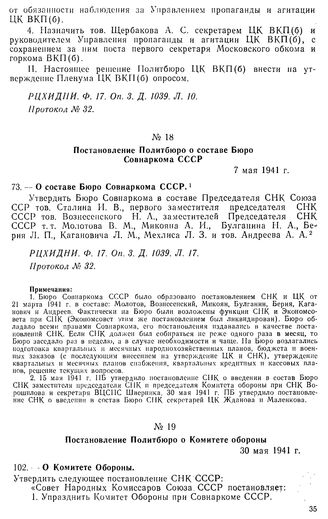 Постановление Политбюро о составе Бюро Совнаркома СССР. 7 мая 1941 г. Протокол № 32 // РЦХИДНИ. Ф. 17. Оп. 3. Д. 1039. Л. 17.