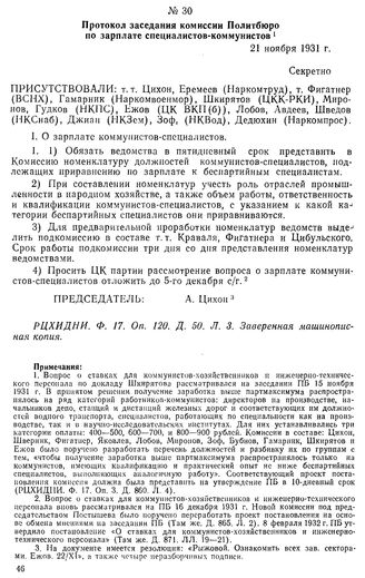 Протокол заседания комиссии Политбюро по зарплате специалистов-коммунистов. 21 ноября 1931 г. // РЦХИДНИ. Ф. 17. Оп. 120. Д. 50. Л. 3. Заверенная машинописная копия.