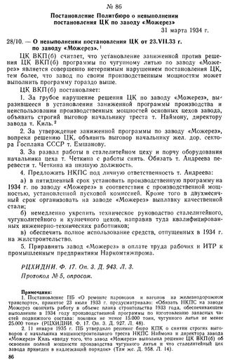 Постановление Политбюро о невыполнении постановления ЦК по заводу «Можерез». 31 марта 1934 г. Протокол № 5, опросом // РЦХИДНИ. Ф. 17. Оп. 3. Д. 943. Л. 3.