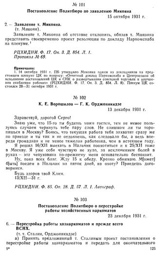 Постановление Политбюро по заявлению Микояна. 15 октября 1931 г. Протокол № 69 // РЦХИДНИ. Ф. 17. Оп. 3. Д. 854. Л. 1.