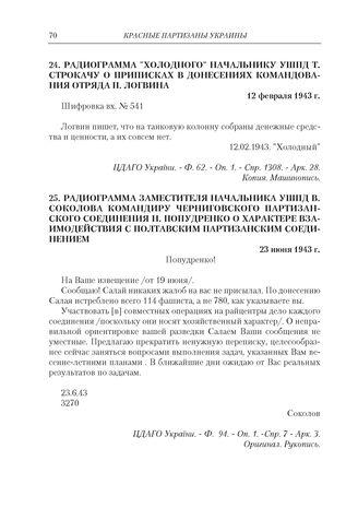 Радиограмма «Холодного» начальнику УШПД Т. Строкачу о приписках в донесениях командования отряда П. Логвина. 12 февраля 1943 г. // ЦДАГО Украіни. Ф. 62. Оп. 1. Спр. 1308. Арк. 28. Копия. Машинопись.