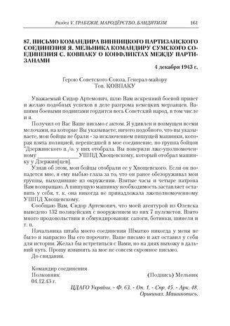 Письмо командира Винницкого партизанского соединения Я. Мельника командиру Сумского соединения С. Ковпаку о конфликтах между партизанами. 4 декабря 1943 г. // ЦДАГО Украіни. Ф. 63. Оп. 1. Спр. 45. Арк. 48. Оригинал. Машинопись.