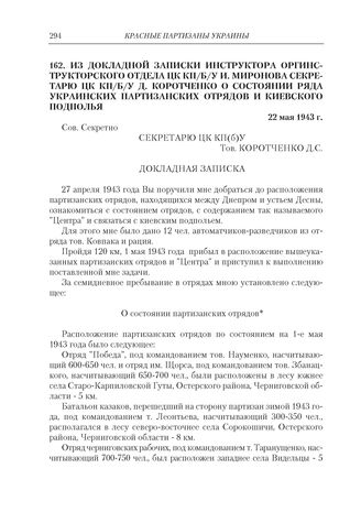 Из докладной записки инструктора оргинструкторского отдела ЦК КП(б)У И. Миронова секретарю ЦК КП(б)У Д. Коротченко о состоянии ряда украинских партизанских отрядов и киевского подполья. 22 мая 1943 г. // ЦДАГО Украіни. Ф.1. Оп. 22. Спр. 8. Арк. 29-48. Оригинал. Машинопись.