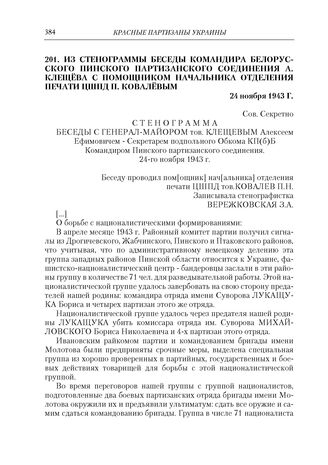 Из стенограммы беседы командира белорусского Пинского партизанского соединения А. Клещева с помощником начальника отделения печати ЦШПД П. Ковалевым. 24 ноября 1943 г. // РГАСПИ. Ф. 69. Оп. 1. Д. 29. Л.л. 148-149. Оригинал. Машинопись.