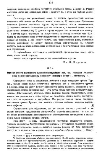 Проект ответа верховного главнокомандующего вел. кн. Николая Николаевича великобританскому военному министру лорду Г. Китченеру.
