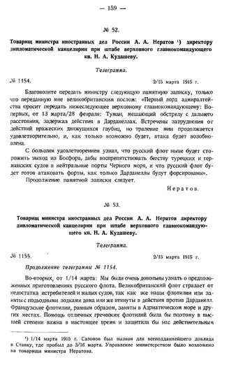 Товарищ министра иностранных дел России А.А. Нератов директору дипломатической канцелярии при штабе верховного главнокомандующего кн. Н.А. Кудашеву. Телеграмма. № 1154. 2/15 марта 1915 г.