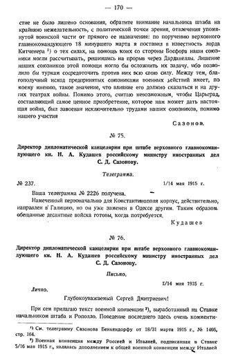 Директор дипломатической канцелярии при штабе верховного главнокомандующего кн. Н.А. Кудашев российскому министру иностранных дел С.Д. Сазонову. Письмо. 1/14 мая 1915 г.