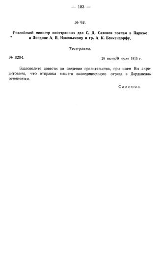 Российский министр иностранных дел С.Д. Сазонов послам в Париже и Лондоне А.П. Извольскому и гр. А.К. Бенкендорфу. Телеграмма. № 3284. 26 июня/9 июля 1915 г.