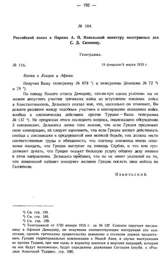 Российский посол в Париже А.П. Извольский министру иностранных дел С.Д. Сазонову. Телеграмма. № 116. 19 февраля/4 марта 1915 г.